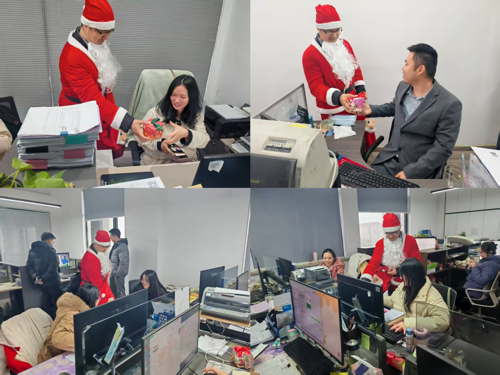 上午9點(diǎn)半,一位身著紅色圣誕服、戴著白色圣誕帽的“圣誕老人”悄然走進(jìn)了車間。在扮演圣誕老人的同事的帶領(lǐng)下,另一位負(fù)責(zé)記錄的同事緊隨其后,他們帶著滿載著祝福的果籃,開始了他們的“送福之旅”。本次活動(dòng)的足跡遍布公司的每一個(gè)角落,從熱火朝天的生產(chǎn)車間到安靜高效的辦公樓層,無(wú)處不洋溢著節(jié)日的溫暖。